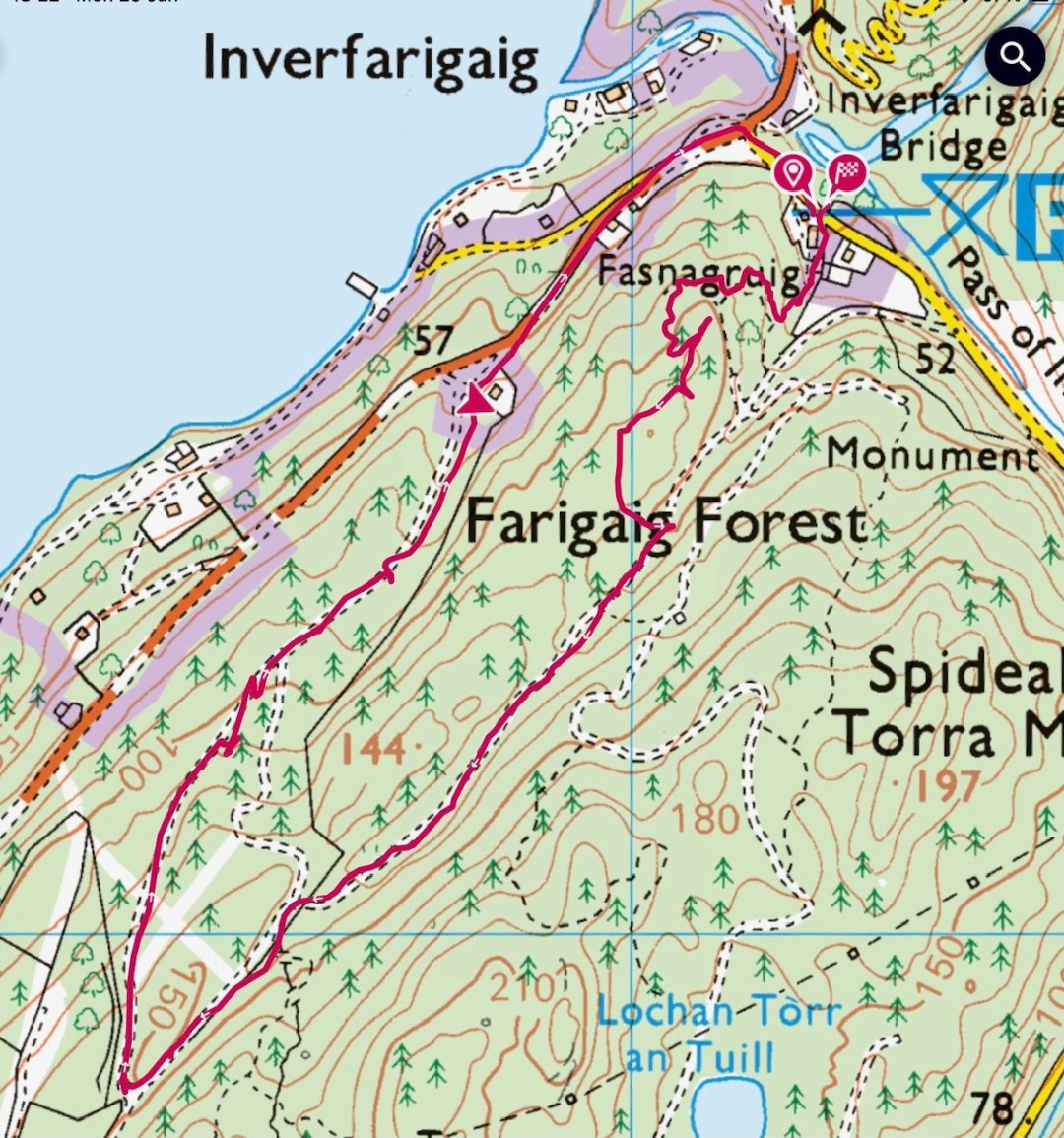 Description: Start from the visitor’s car park in Inverfarigaig and head steeply uphill on a rough path for a short distance then take the first track on the right following it up and round until you come to a view point with a bench. Carry on past this and keeping to the track which curves back and forth before taking you downhill to join the main track that you turned off. Turn right and follow this main track which is now on a much more gradual incline. Ignore any signposts and way marks and you will arrive at a junction with a large unmarked track on the right which you take to descend gradually, passing two houses on your right before reaching the road. Turn right and follow the road a short distance to the junction signposted Errogie and turn right here to arrive back at the visitor’s car park.