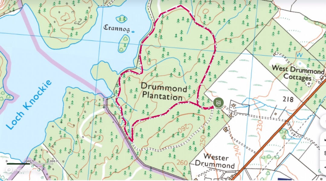 Description: Take the track off the B852 mid way between West Drummond Cottages and Wester Drummond. Park in the open area beyond the two white houses. Go through the large gate and follow the forestry road, keeping to the right at the first junction.